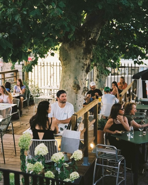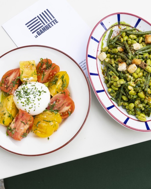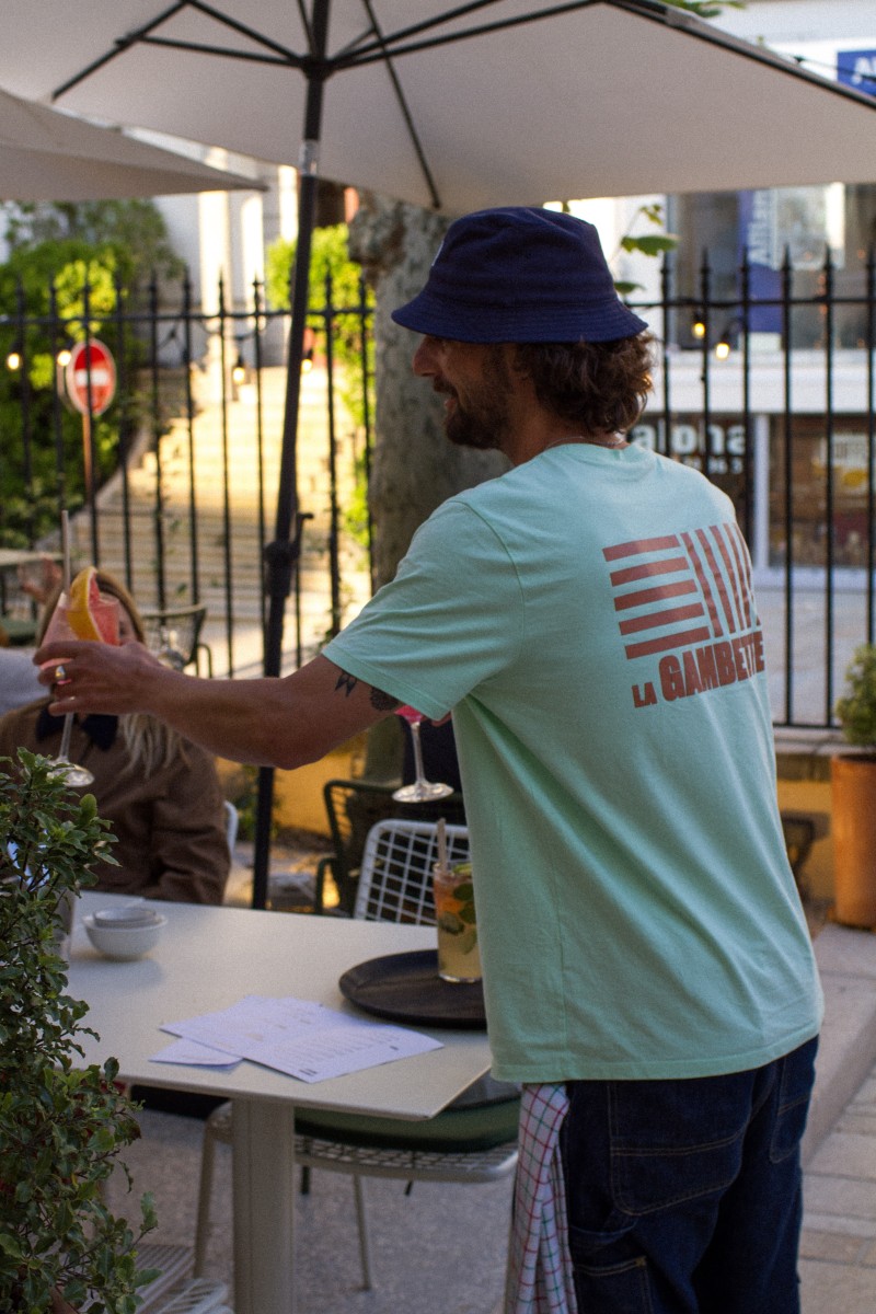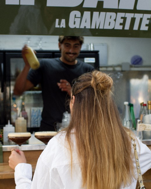 Dans une atmosphère de fête de village, tables et chaises s'assemblent et se rassemblent autour du bar extérieur et sous les guirlandes lumineuses. À quelques mètres des Halles, les platanes et les parasols donnent à La Gambette des airs d'été, de vacances, de plein air.