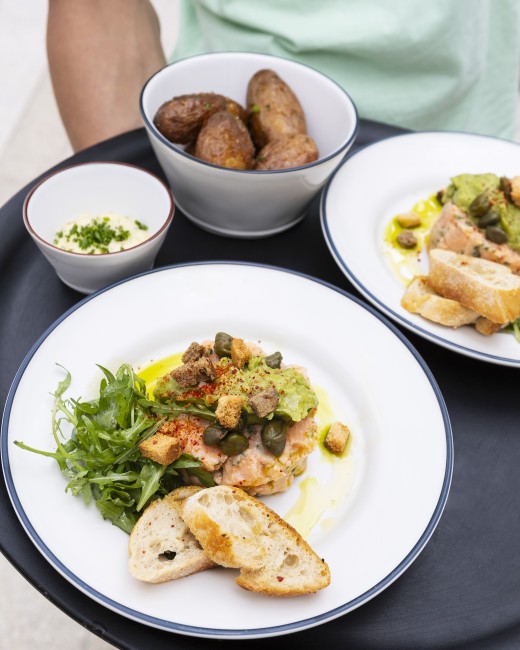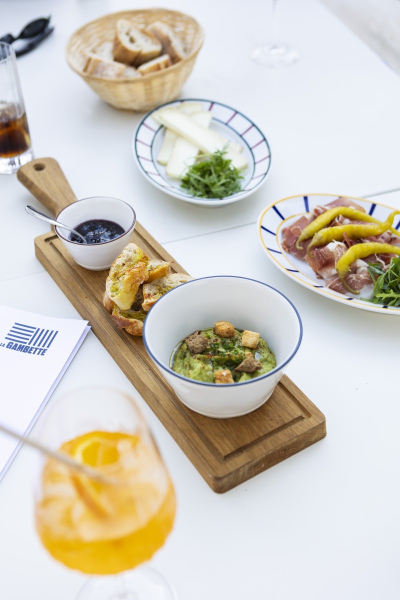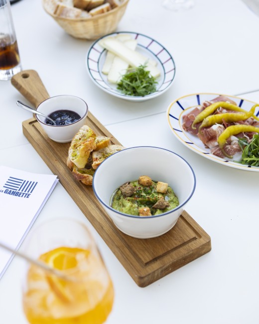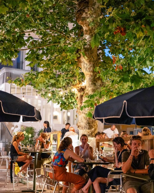 Dans une atmosphère de fête de village, tables et chaises s'assemblent et se rassemblent autour du bar extérieur et sous les guirlandes lumineuses. À quelques mètres des Halles, les platanes et les parasols donnent à La Gambette des airs d'été, de vacances, de plein air.